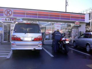 今回は岡崎の会社の後輩(二人)も誘いました。集合場所のコンビニに到着しましたが、VTR君はバイクのエンジンが掛からず残念ながら車での見送りでした。ドラックスター君も雪がちらつきだし、ちょこっとイヤイヤモードです。
