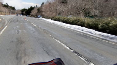 (道路の脇には雪があり、気温は1℃)