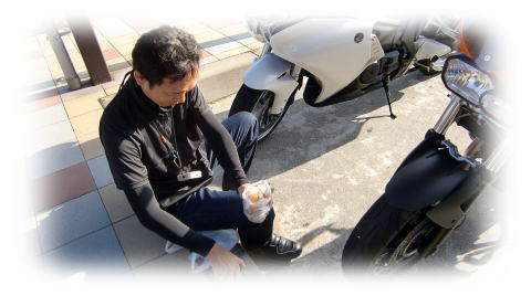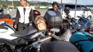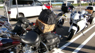 買出し終了後、荷物を手分けし、バイクに積み込みます