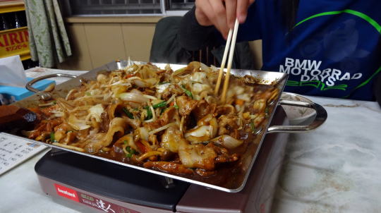 鉄板の上に高々と、野菜と豚肉が富士山のように盛られています