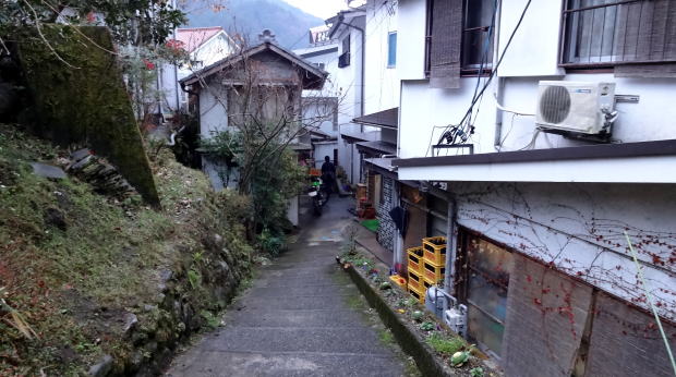 そのまま階段を下り、旅館の玄関の前まで突入しちゃいました。
