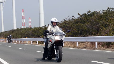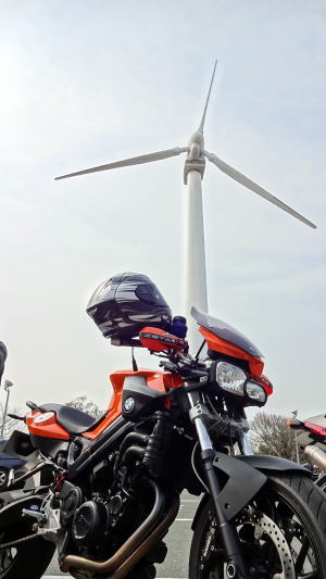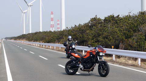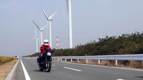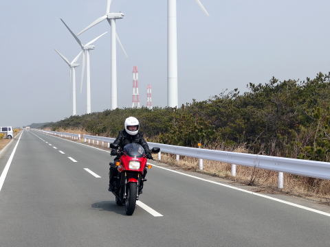 県道2 〜 R259 〜 県道412 〜 堤防道路(変な道)を走り、渥美風車群に到着