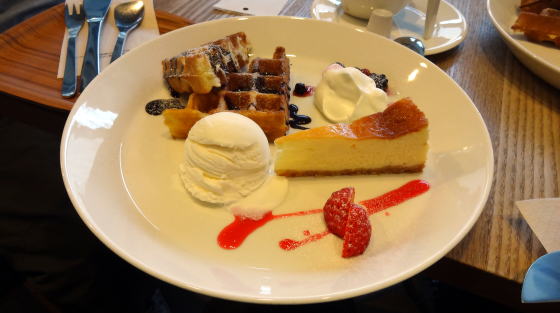 ワッフル・ハーフサイズケーキ・アイスがのった欲張りデザート