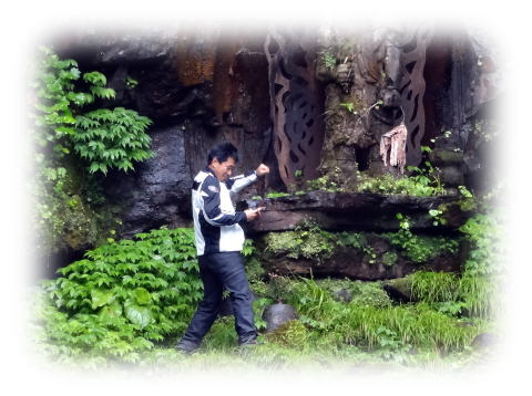 道の駅の駐車場にバイクを置き、ここからはタンデムで滝に向かいます。