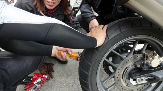 ゆかりんが持っていたパンク修理キットを使い、Y2Kさんが責任を感じたのか修理作業をしました