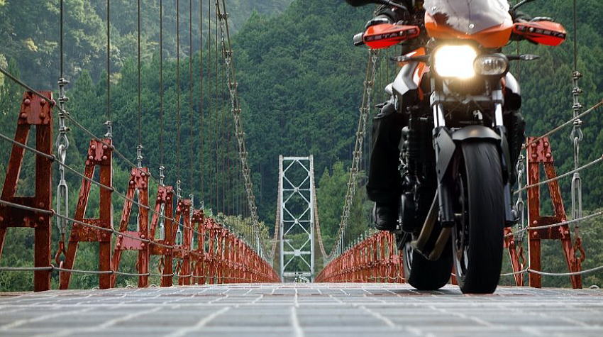 橋の上にバイクを止めるのには繋ぎ目の鉄板部分しかスタンドが出せません。