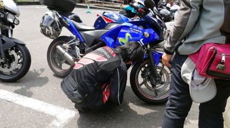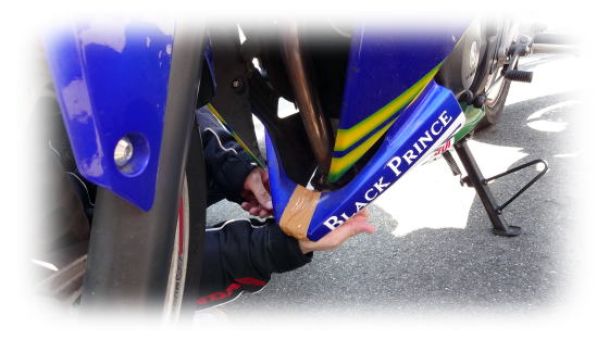 彼の激走に耐えきれず、カウルの留め金パーツが脱落しブラブラ状態です。