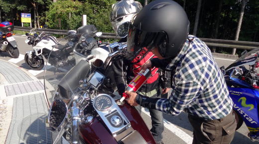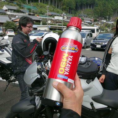 本宮の手前20km付近の山の中で、入道さんのハーレーがガス欠となってしまいました。
