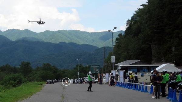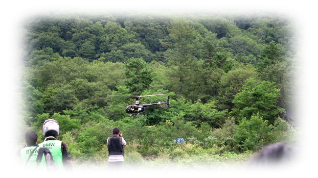 川の向こう側の広場にヘリが着地し、そこからバイクに乗り換えてコチラに来るようです
