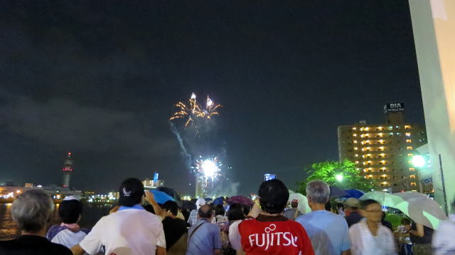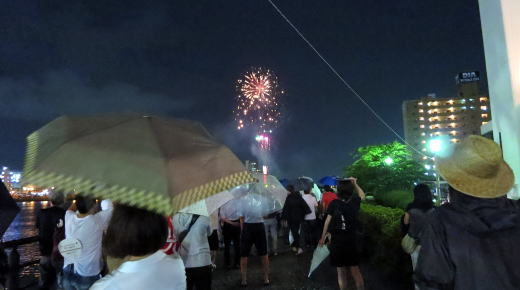 お祭りの最後は花火が見れるようなので、川沿いに移動し