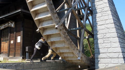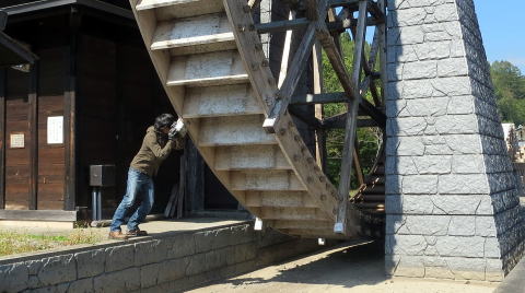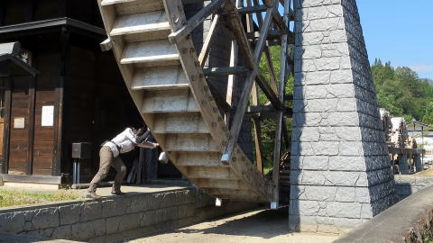 巨大な水車を、手で押して回す方々