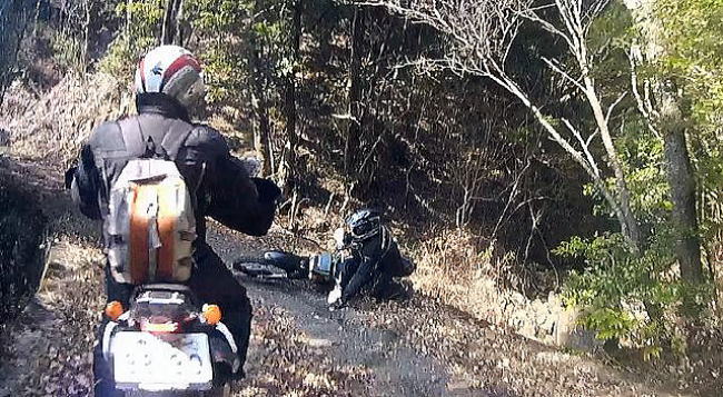 彼はモタード用のタイヤなのに狂ったような走りで、僕を脅かします…