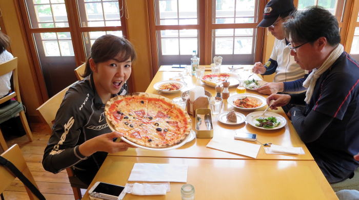 大きなピザですが、ガッツリいっちゃう? 美春ちゃん
