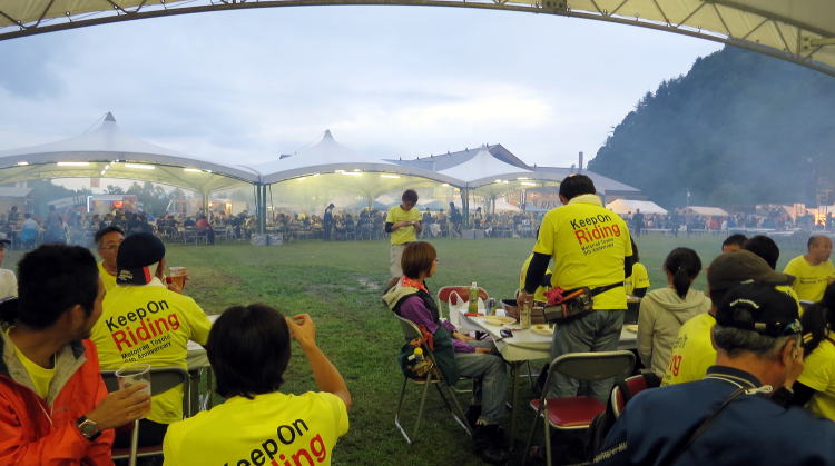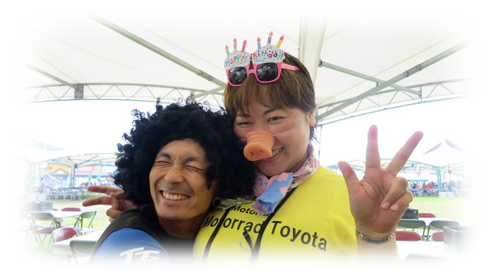 宴会スタイルはモトラッド豊田、特製黄Tシャツを着用です