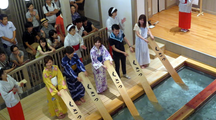 外湯巡りの前に、湯もみショーの見学です