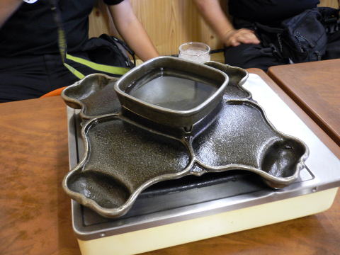 初めて見る鉄板です。中央には水が入っていてここに野菜を投入。ジンギスカンスタイルとは少し違います。1つのコンロには4人が座り、目の前のスペースで肉を焼くので人に盗られる心配がありません。