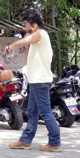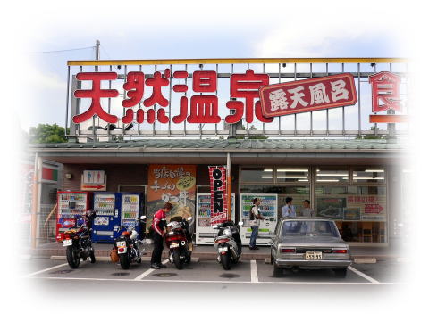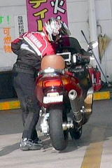しばらくして関東のネパ君が登場です。夜中に出発したようですが、相変わらずラフなスタイルでの参戦です。バイクには途中で立ち寄った健康ランド定番の○○○が、装着(?)されてました。
