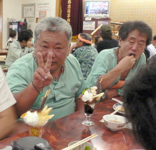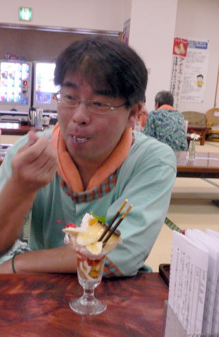 おやじんはのんきにポーズを決めてますが、まなさんがパフェを狙ってるみたい。