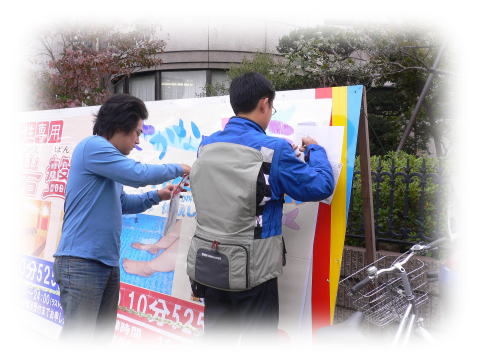 朝から看板にイタズラしている、お二人さん?