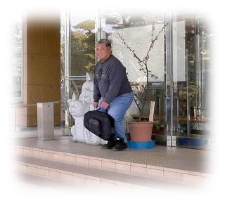 ホテルの入り口で虎三さんのリクエスト(?)に答えてポーズをとるおやじん