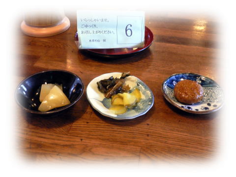 ざるそばを注文するととりあえず、漬物とそば団子のサービスです