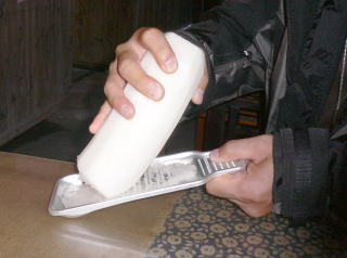 オーダーが終わると店員が大きな大根を持ってきました。今まで自分で生姜やわさびをおろして食べるスタイルは体験ましたが、大根は初めてでした。少々戸惑っていると、同席してくれたポチさんが手際良くおろしてくれました。