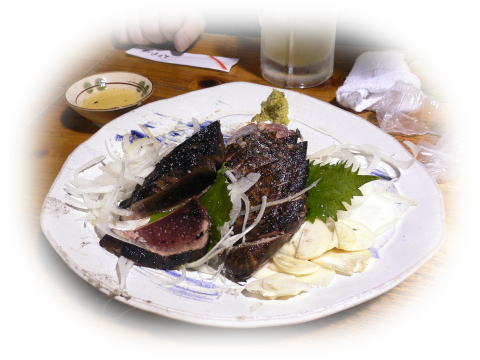 「明神丸」の鰹のたたきですが、このお店はわらで焼いていました。初めて食べましたが他のお店の鰹とは違い、焼き具合がちょうど良く最高の味でした。塩の他にノーマルのタレ味も食べましたが、こちらも美味しかったです。