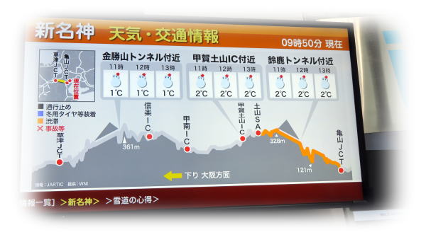 日中の出発なら大丈夫と判断したのがハズレ、四日市付近からは雪模様の最悪な天候となりました。